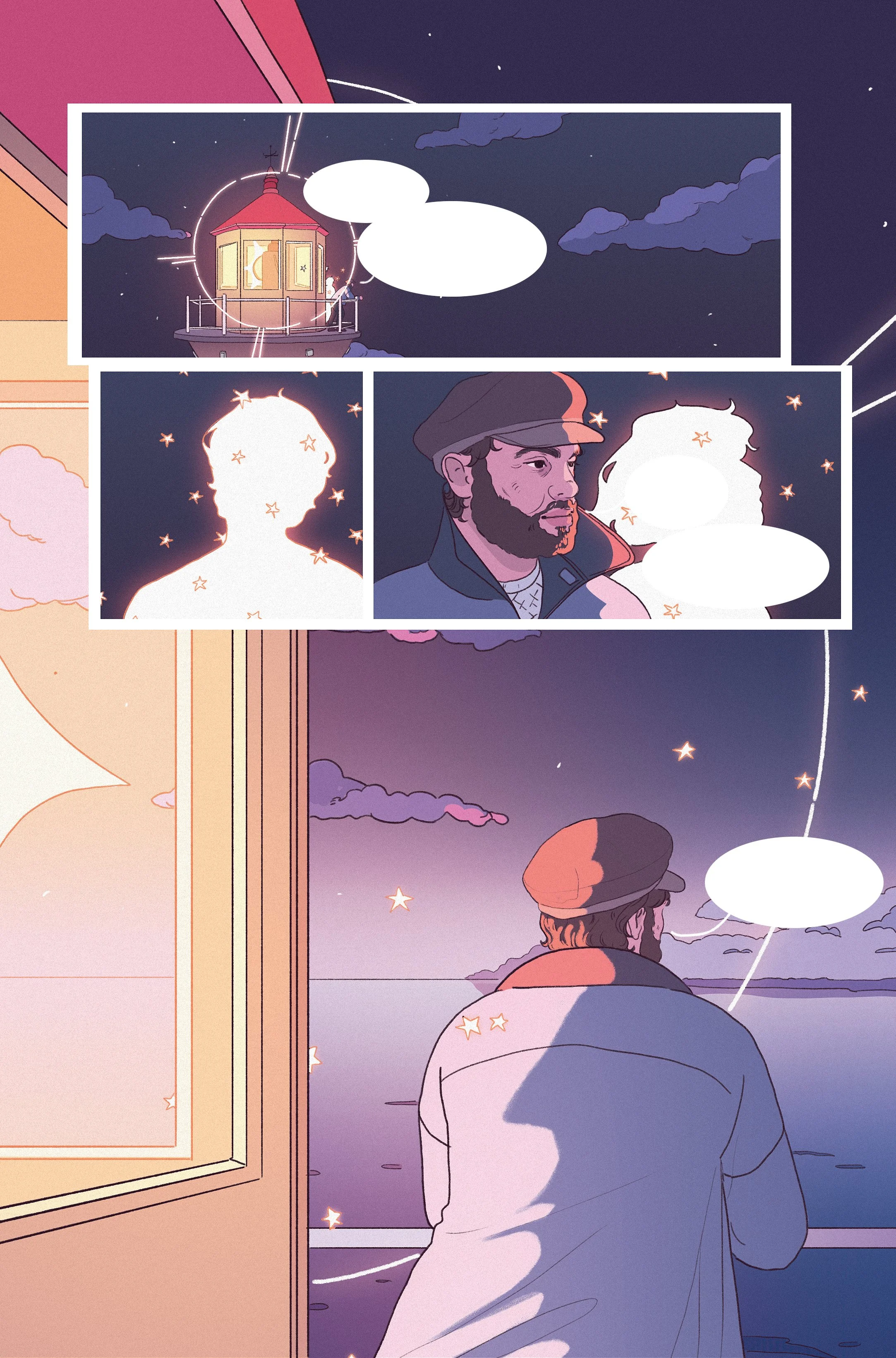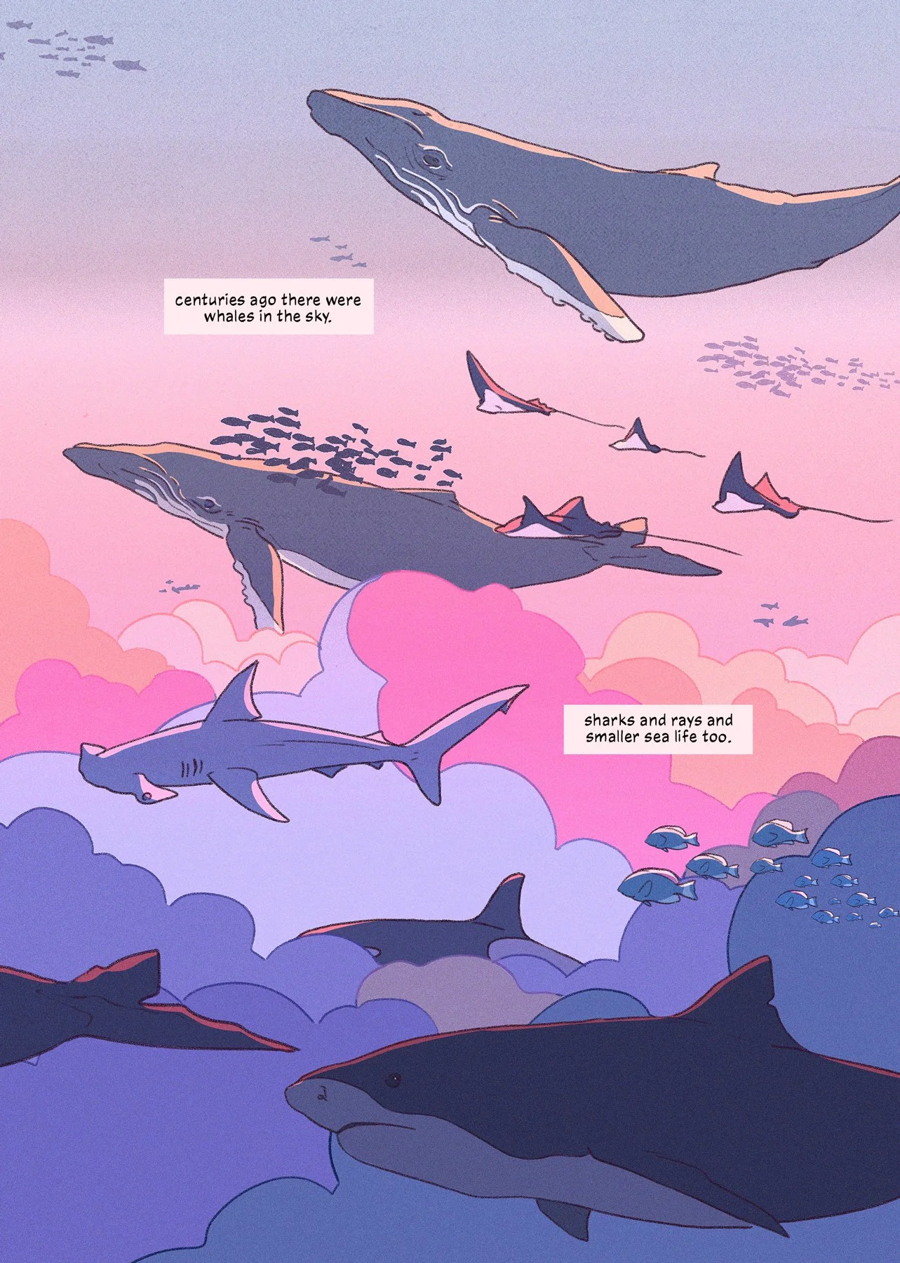 Forgotten Oceans. In a fictional world were marine life once lived in the skies, ‘Forgotten Oceans’ poeticly tells the tale of their disappearance and touches upon the real life climate crisis that’s impacting our oceans creatures. (12 pages, Self Published, 2024) Read on Itch.io